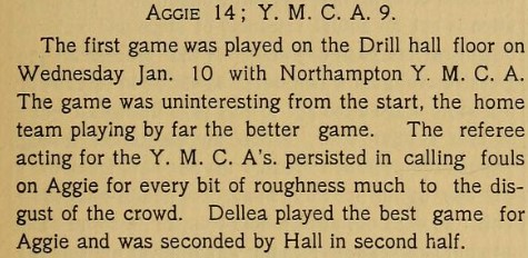 The first game was played on the Drill hall floor on Wednesday Jan. 10 with Northampton Y. M. C. A. The game was uninteresting from the start, the home team playing by far the better game. The referee acting for the Y. M. C. A.'s persisted in calling fouls on Aggie for every bit of roughness much to the disgust of the crowd. Dellea played the best game for the Aggie and was seconded by Hall in second half.
