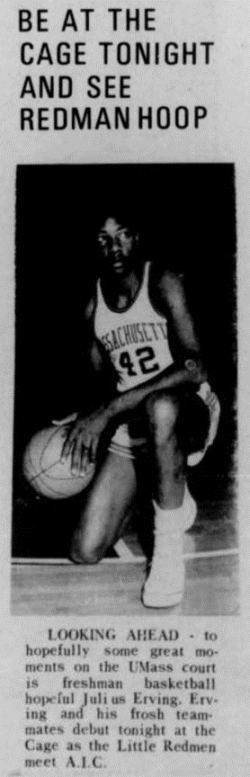 Top performers thus far have been forwards Julius Erving, 6’4 (Roosevelt, NY), Rich Vogeley, 6’5 (New Hyde Park, NY), and Bill Kesgen, 6’5 (E. Rutherford, NJ), center Tom Austin, 6’8 (Swansea, MA), and guards John Betancourt, 5’11 (Westwood, NJ), Mike Pagliara, 5’10 (Wyckoff, NJ), Chris Nichols, 6’ (Madison, CT) and Don Moore, 5’10 (Shelburne Falls, MA).