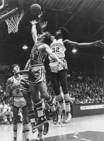 HOOP NOTES— With one minute and one second to go, Erving was taken out of the game, and received a standing ovation of about 40 seconds… Head UMass coach Jack Leaman summed up his feelings after the game in one word, “Great!” UMass shot a fine 52 percent from the floor for the whole game, recording that mark after shooting only 44.7 in the first half… Vogeley was fourth highest scorer for the Redmen, with ten points in only 14 minutes of play… He was just a little off from playing a really great game as he picked up some quick fouls and missed a couple of hoops by only inches….Bill Kesgen, Tom Austin and Bill Greeley played well for UMass in reserve roles. …The Redmen also shot well from the foul line–87 percent… Whichever referee called the traveling violations on Erving must have been watching the guy for the first time… Because of the way Erving can control the movements of his body, it is often easy to mistake one of his steps for three of another basketball player… How about those new uniforms! The reaction to these new spanking-white UMass shirts, shorts and warm-up clothing was very much in the affirmative whomever one talked to… They sure did brighten up the dull yellow-aura of the Cage.
