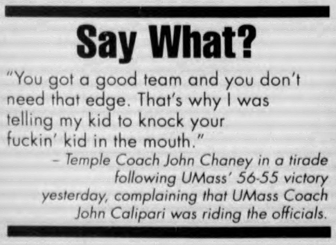 In February 1990, Temple beat UMass 83-82 in triple overtime at Curry Hicks Cage, but it was what happened late in regulation that grabbed headlines. Chaney was meeting with officials about a shot clock error that negated the Owls a basket, and Calipari tried stepping in to be part of the discussion. Chaney then shoved Calipari and the two had to be separated by their assistants.