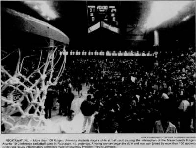 The game was halted prior to the second half after about 150 students staged an on-court demonstration, apparently in protest of controversial racial remarks made by Rutgers president Francis L. Lawrence.