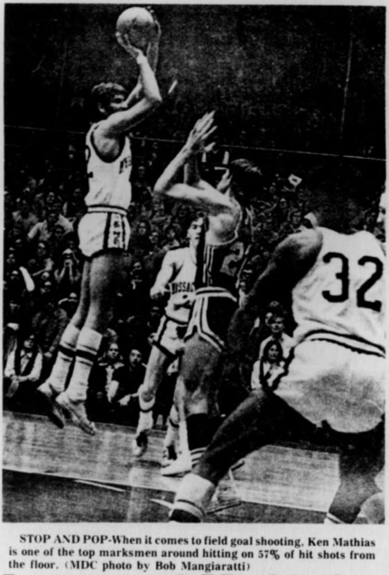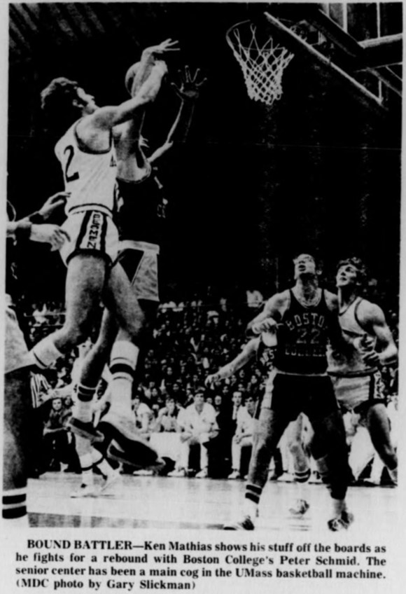 Freshman Coach Peter Broaca, who had coached at Pascack High in New Jersey before his travels brought him to UMass, should perhaps take a pat on the back for having cited Mathias as college ball material. It was Broaca who scouted, recruited, and later coached the schoolboy sensation from nearby Lodi (N.J.).